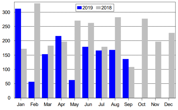 In the above chart and all that follow, the blue bars represent the number of net new jobs for each month. The grey bars represent the net new jobs that were created in the year-ago month.
